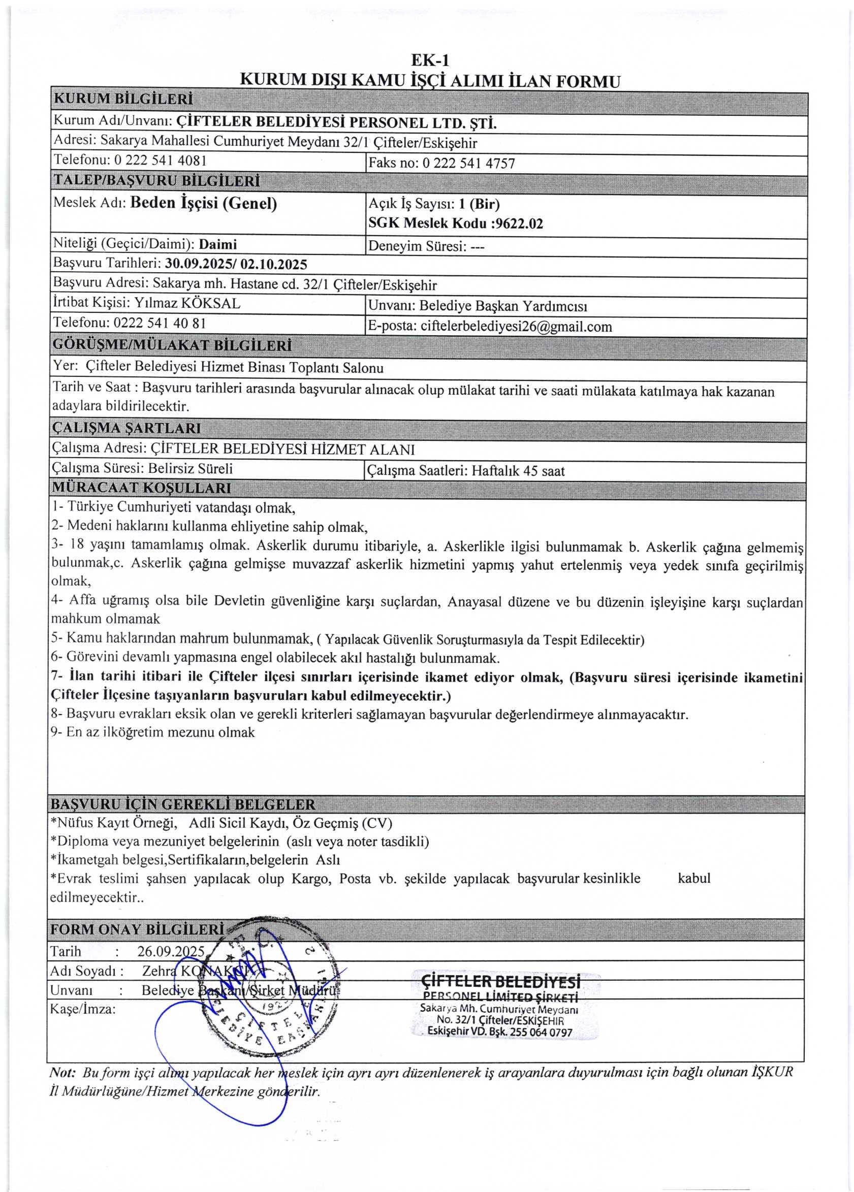 Çifteler Belediyesi Personel Ltd. Şti. için personel alımı başladı. Alınacak unvan ve sayısı: 1 adet Beden İşçisi (Genel) alımı için tüm şartlar şu şekildedir: